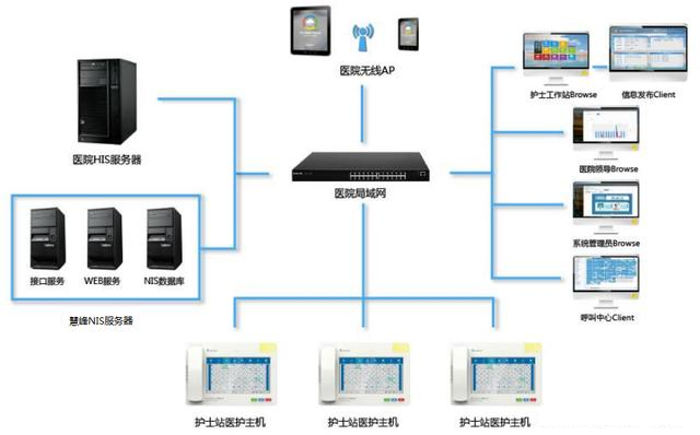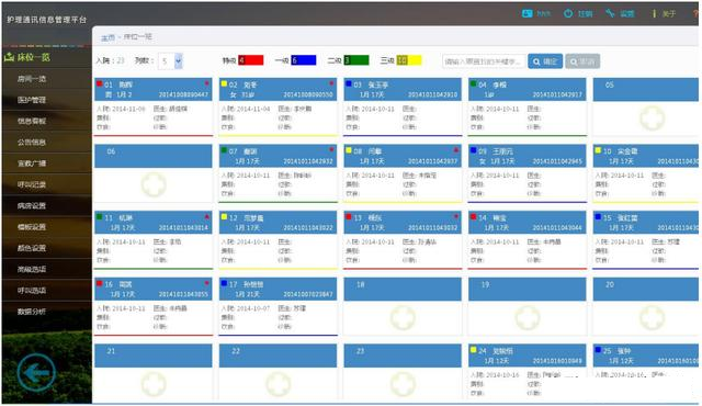 ● 基于 B/S 架構,支持床位和房間一覽表管理與顯示,支持住院人數、護理級別人數 統計和關鍵字搜索,可完成入院登記、出院、換床、欠費催繳、服藥提醒、二維碼掃描 等日常業務。提供床頭、門口、信息看板等圖形用戶界面的在線編輯工具,支持日常呼 叫護理記錄查詢、導出和錄音回放,具有完善的醫護人員排班、病區公告信息、護理標 識預警顏色等管理功能。