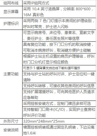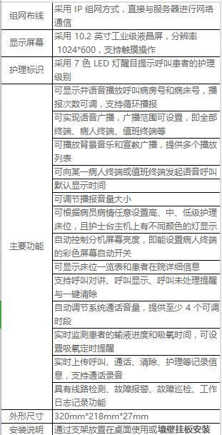 ● 通過護士站液晶電視,可顯示床位一覽表和實時呼叫信息,也可顯示護理工作一覽 表,包括病區當日患者流動、住院人數、病危病重、手術安排、值班醫生、要事留言等 信息。