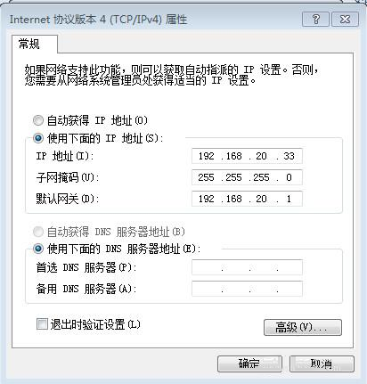ip是192.168.20.33,子網掩碼是255.255.255.0,網關是192.168.20.1