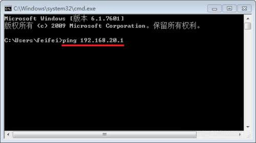 測試內網:拔掉外網網線(或者禁用外網網卡),打開cmd窗口,輸入命令 ping 192.168.20.1 ,看是否能ping通,如果不能,請檢查網線連接。