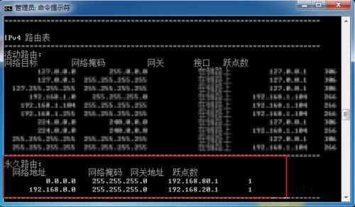 在CMD窗口中,輸入route print,查看是否成功配置,如果成功會顯示下圖紅框信息(ip,網關等產生因實際情況而異)