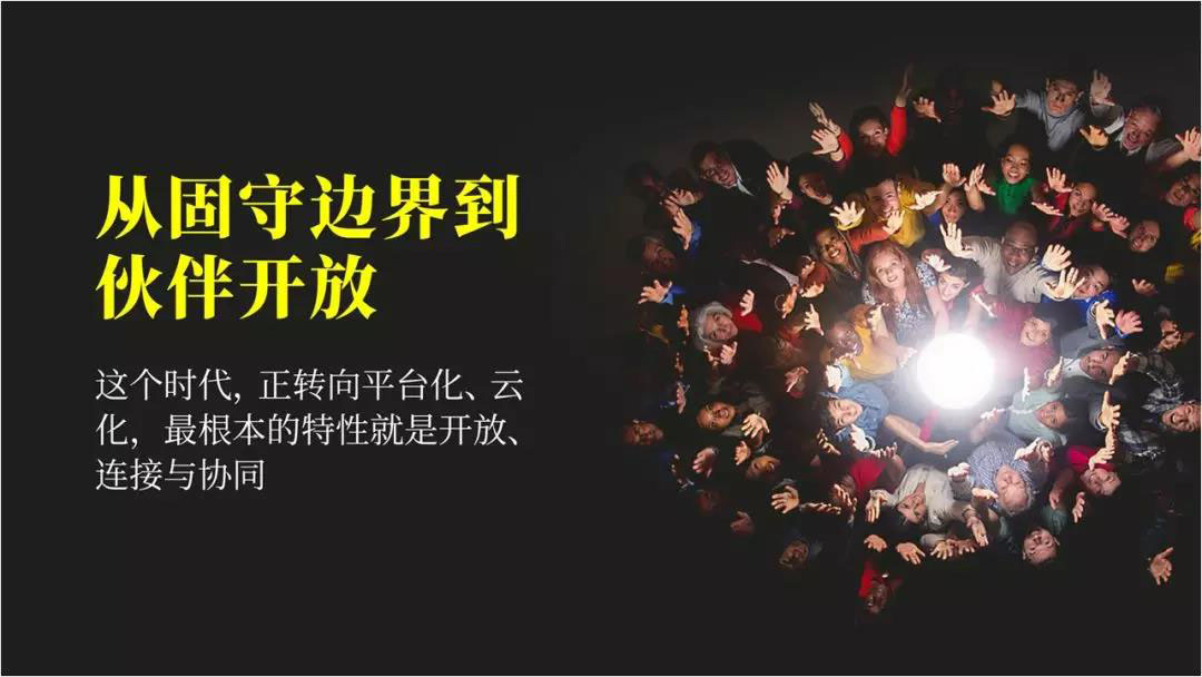 平臺化和云化最大的特征是什么?就是開放、連接與協同。我們做任何事情,尤其是做企業的人,要懂的一件事情就是企業的邊界。在邊界里邊,組合各種要素的效率和成本比別人快,企業就有競爭力。但是今天互聯網最大的變化是,組合要素的效率和成本在企業外部更快,互聯網打破了邊界。當你能夠伙伴開放的時候,其實你就可以真正做連接和協同。