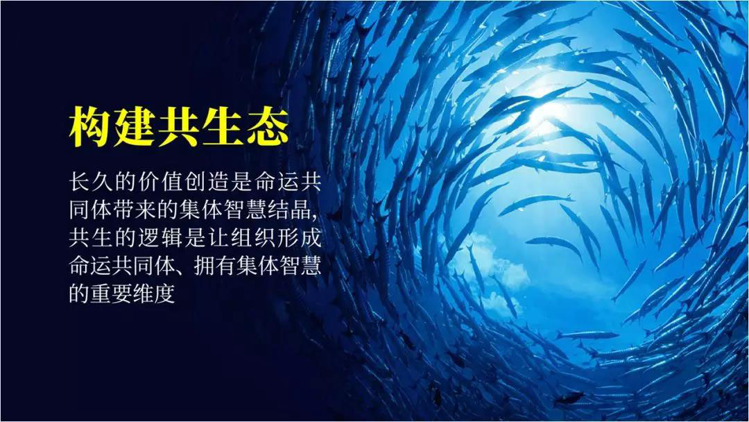 當能夠形成命運共同體的時候,其實我們就擁有了無限的去解決問題的可能性。當能夠擁有無限解決問題的可能性的時候,我們其實就有了一個共生的概念。長久的價值創造是命運共同體帶來的集體智慧結晶,共生的邏輯是讓組織形成命運共同體、擁有集體智慧的重要維度。
