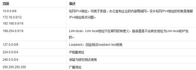 IPv4地址中有一些地址段有特殊用途,這些地址段及用途的說明如表1所示。