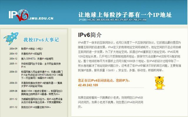 我們設置完成后可以輸入http://ipv6.jmu.edu.cn/網址測試下是否成功,如果你能夠看到一只跳舞的小老虎,則說明你以IPv6訪問該網頁,如果小老虎不跳舞,則是以IPv4訪問該網頁。