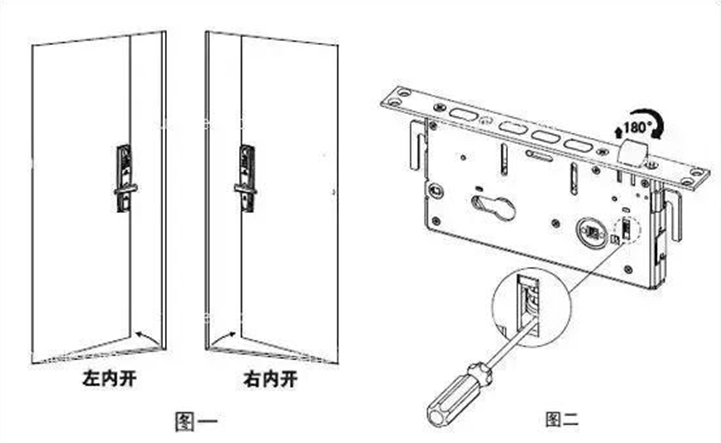 1、確定好鎖舌的方向和開門的方向符合。如果不是,用螺絲刀將指紋鎖鎖體斜舌頂起,旋轉180°后松開螺絲刀讓其復位即可。