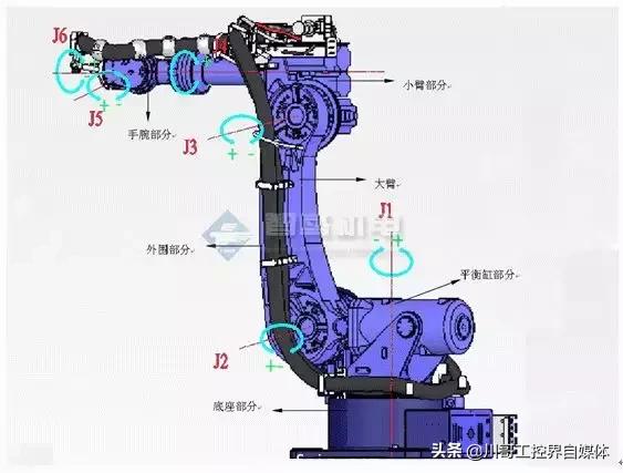 .常見機器人自由度數一般有5~6個。有些機器人還附帶有外部軸。