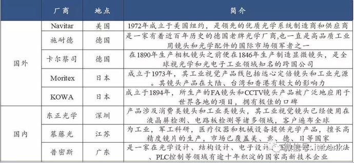 低端鏡頭國內(nèi)企業(yè)具備一定競爭力,高端鏡頭基本依賴進(jìn)口。鏡頭的基本功能是實(shí)現(xiàn)光束調(diào)制,將目標(biāo)成像在圖像傳感器的光敏面上完成信號(hào)傳遞。工業(yè)鏡頭主要可以分為定焦鏡頭、定倍鏡頭、遠(yuǎn)心鏡頭、連續(xù)變倍鏡頭等,不同的鏡頭根據(jù)要求應(yīng)用于不同的工業(yè)現(xiàn)場,價(jià)格差距也較大。
