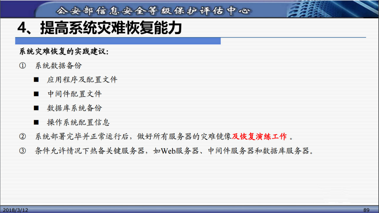 4、二到四級的從字面上看管理要求是一樣的,都是要求制定災難恢復計劃(包括備份與恢復策略以及備份與恢復程序),但不同級別對于災難恢復計劃的內容是不一樣的。