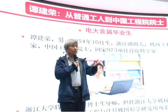 譚建榮分享了自身年輕時期的學習、工作經歷,介紹自己出生于動蕩年代,初中畢業后因為特殊時期“求學無門”,做了15年的技術工人,在中央廣播電視大學開始招生之時,把握住了這彌足珍貴的機會,成為電大的首屆學生。三年時間里他一口氣修完機械工程和電子工程兩個專業的課程。“不斷學習和不斷提高是人生永恒的主題”,他說,電大課堂上樹立起來的求實學風對他有著深遠影響。譚建榮以蘇步青、華羅庚等科學家的人生經歷詮釋了實事求是的科研態度;用自己的座右銘、諸葛亮的《誡子書》和王國維《人間詞話》,叮囑在場師生們在生活和學習中要肯努力、肯勤奮、肯吃苦,以創新和拼搏精神贏得出彩人生。譚院士結合自身經歷,旁征博引,從不同的角度與層次闡述了自己對終身學習的理解,引起現場師生的強烈共鳴和深刻思考。