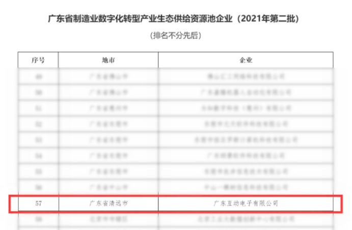 近日,廣東省制造業(yè)數(shù)字化轉型產(chǎn)業(yè)生態(tài)供給資源池企業(yè)(2021年第二批)評審結果公示,廣東互動電子有限公司憑借出色的產(chǎn)品技術、優(yōu)秀的服務案例成功入選。