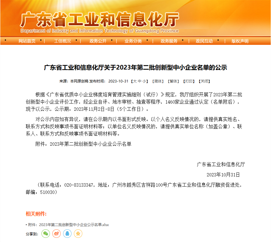近日,從廣東省工業(yè)和信息化廳關于2023年第二批創(chuàng)新型中小企業(yè)名單的公示悉知:我司成功通過2023年第二批創(chuàng)新型中小企業(yè)名單。